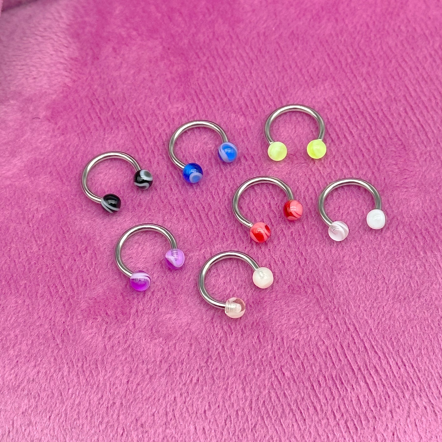 Bring a pop of colour to your piercing stack with our acrylic marble horseshoes — bold, versatile pieces designed to switch up your look. Available in 7 striking shades, each one is sold per piece and can be styled your way — whether that’s in a septum, daith, or cartilage piercing.