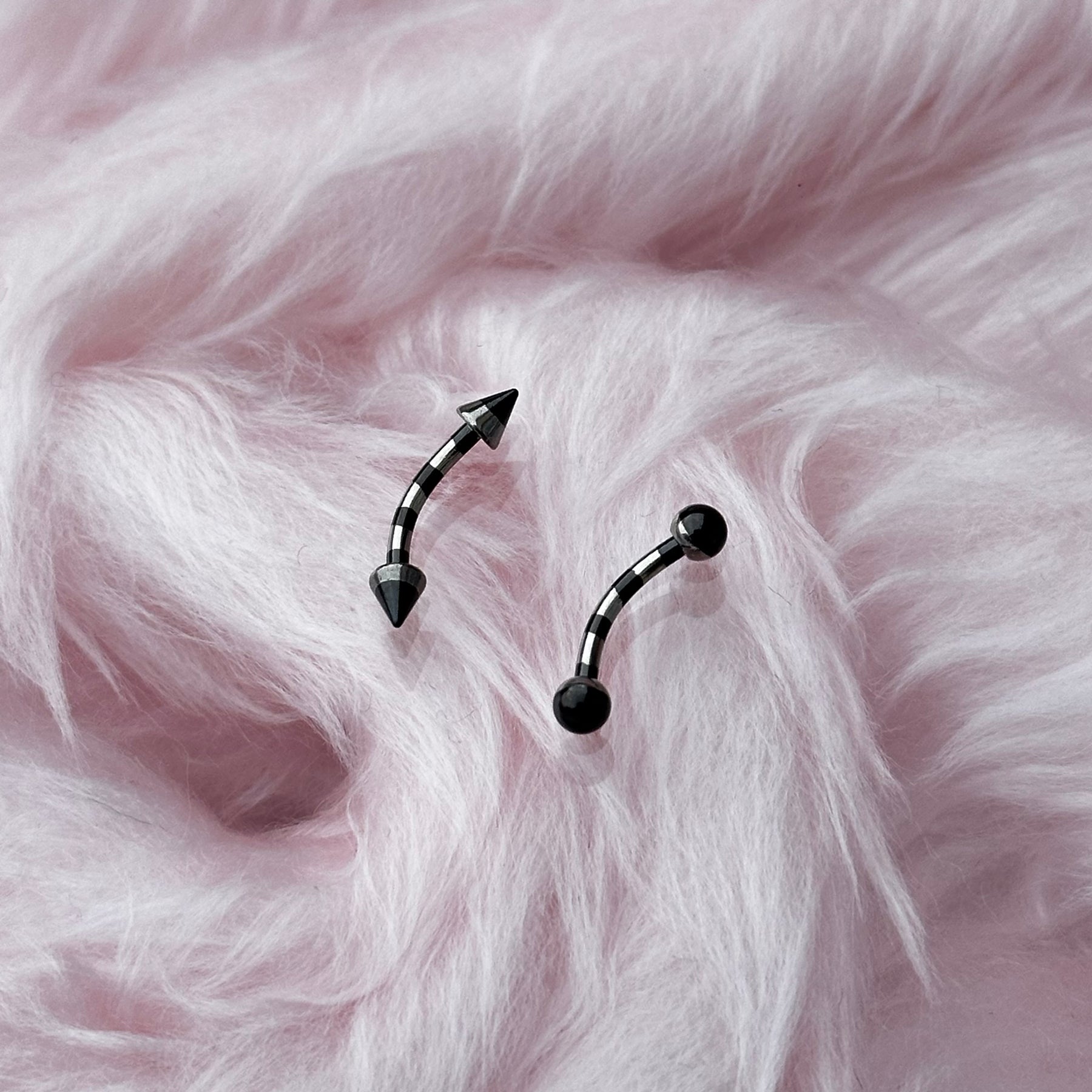 Our Black & Steel Stripe Curved Barbell blends sleek contrast with a bold edge. Crafted from surgical steel for lasting shine and comfort, it’s designed for healed piercings only and finished with your choice of spike or ball ends to match your vibe.
