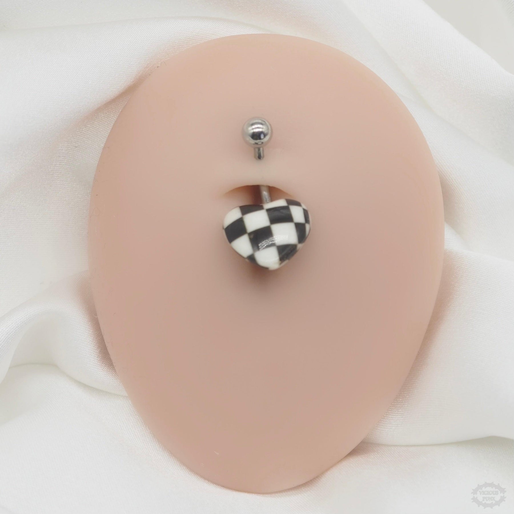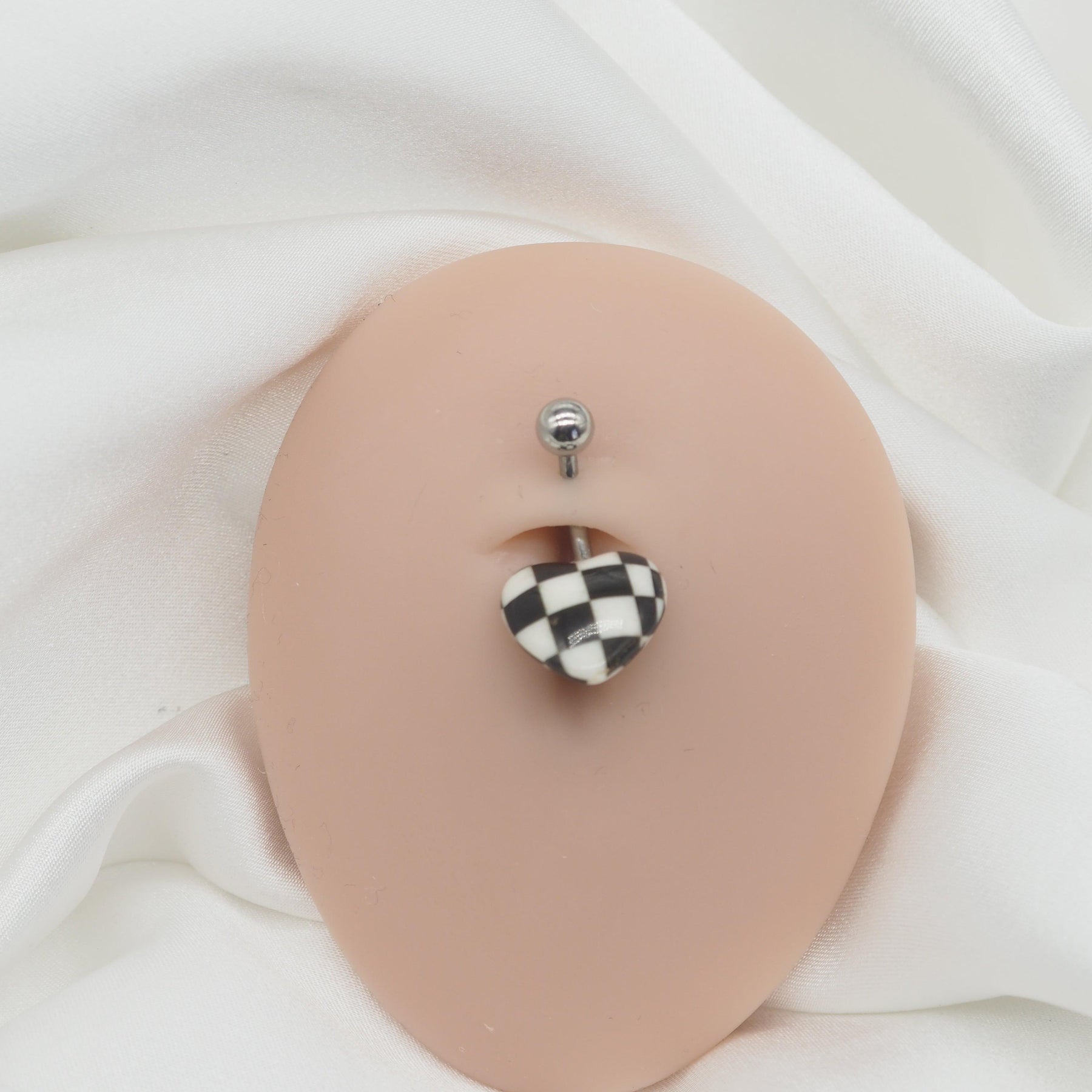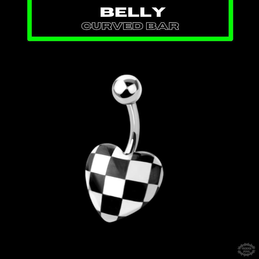Add bold detail to your piercings with the **Checkerboard Heart Belly Bar** — designed for both comfort and statement style.