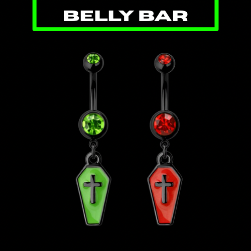 Introducing our quirky coffin belly bar - perfect for anyone looking for a unique piece of body jewelry! Made with surgical steel and adorned with sparkling CZ gemstones, this 14GA (1.6mm) bar comes in your choice of red or green. Add an edgy touch to your look with this 10mm bar, sold individually.